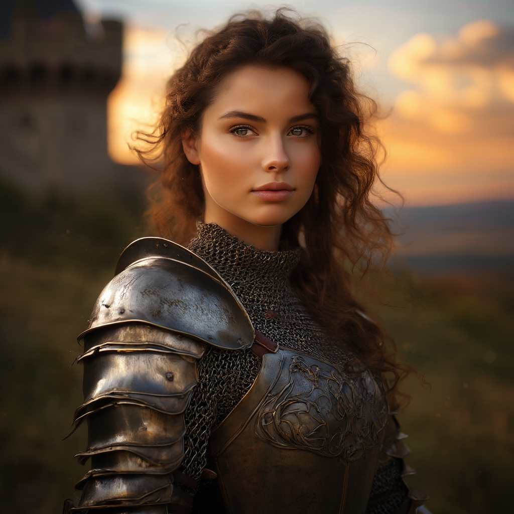 (masterpiece), (extremely intricate:1.3), (realistic), portrait of a girl, the most beautiful in the world, (medieval armor), metal reflections, upper body, outdoors, intense sunlight, far away castle, professional photograph of a stunning woman detailed, sharp focus, dramatic, award winning, cinematic lighting, octane render unreal engine, volumetrics dtx, (film grain, blurry background, blurry foreground, bokeh, depth of field, sunset, motion blur:1.3), chainmail